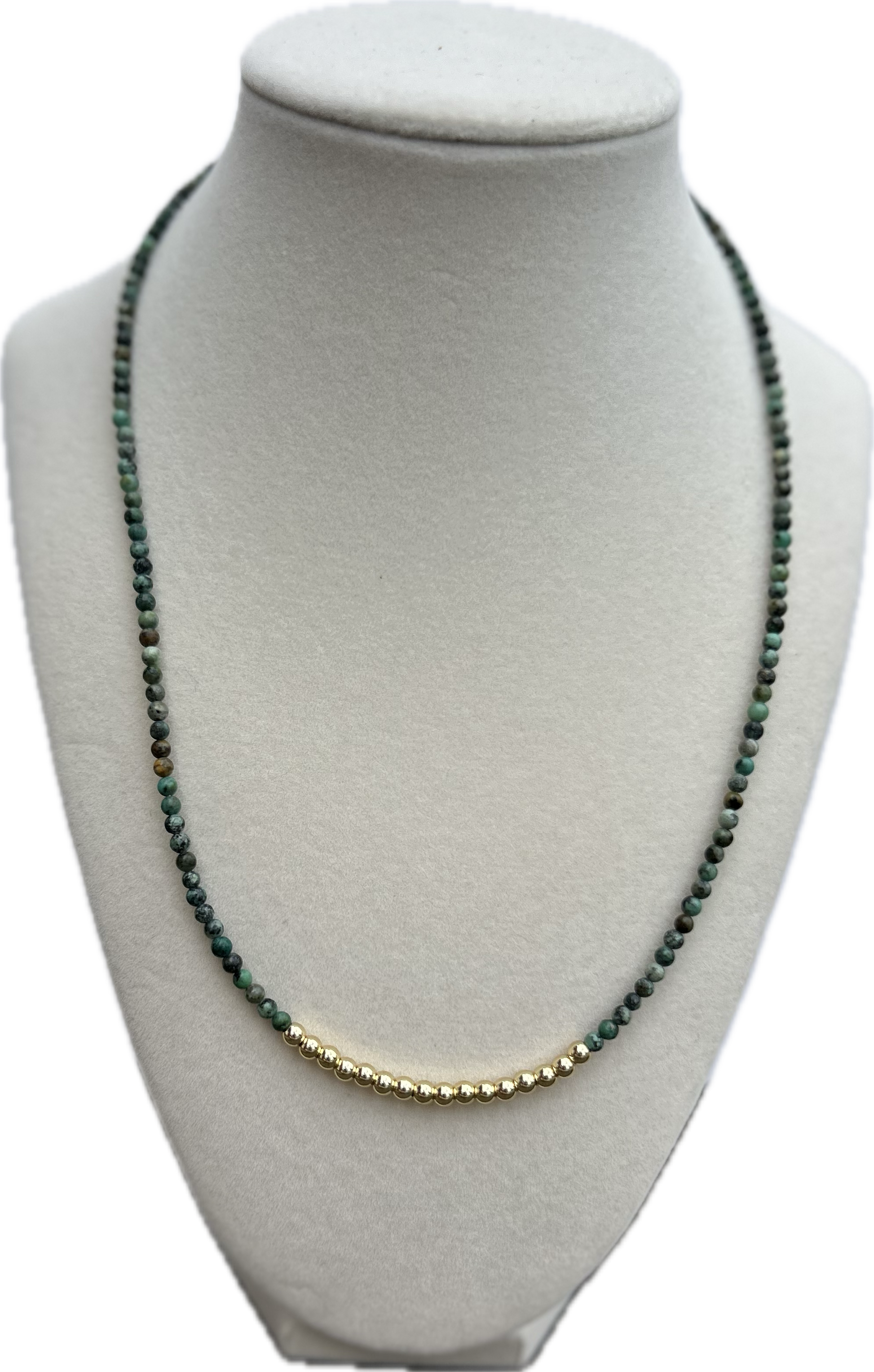 This elegant necklace is crafted with genuine African Turquoise gemstones, known for their earthy green and teal tones with natural flecks of brown and black. Often called the Stone of Evolution, African Turquoise is believed to bring transformation, growth, and positive change, making it both a meaningful and stylish choice.
