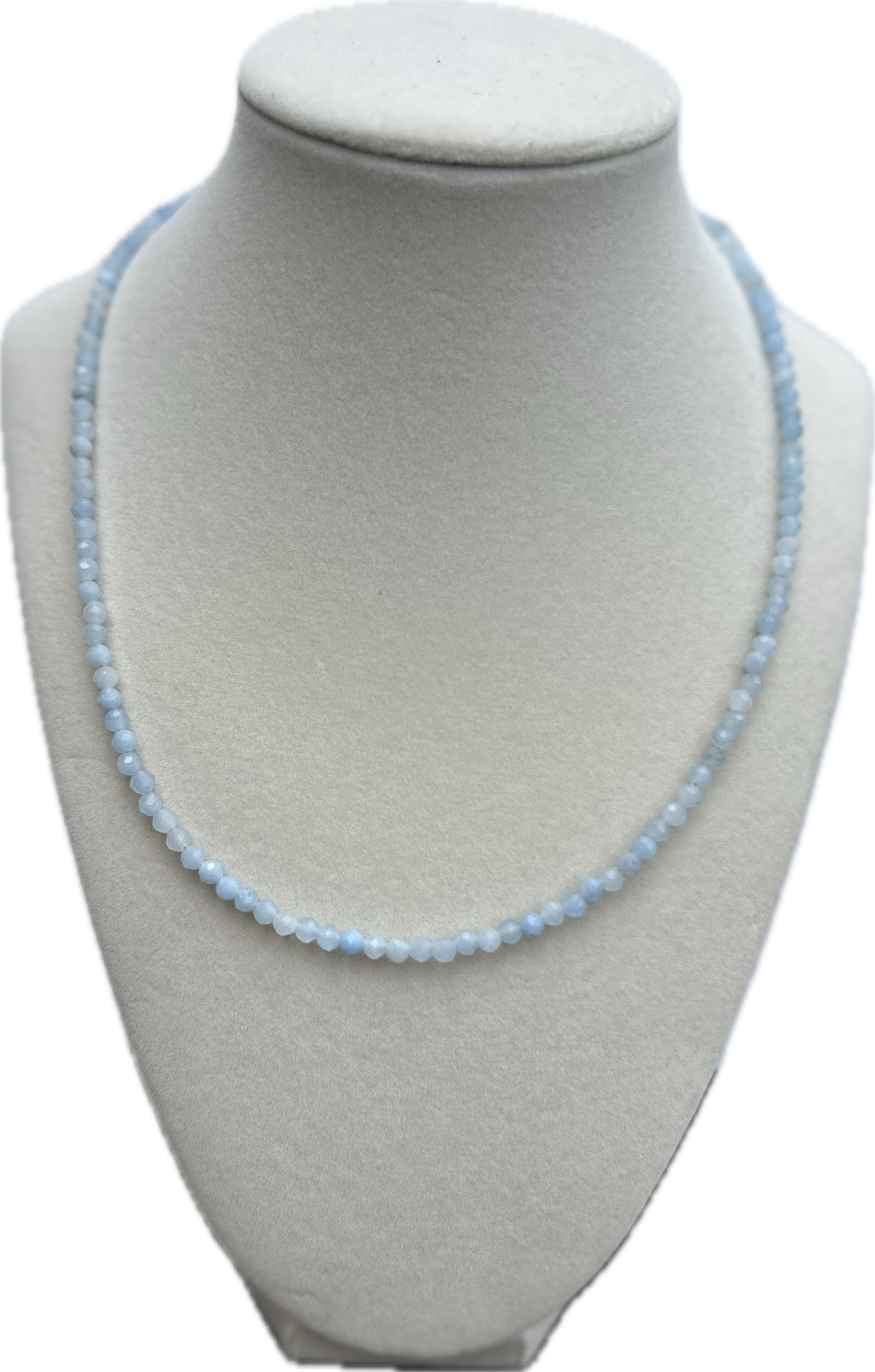 This delicate necklace features faceted aquamarine beads, their soft blue tones shimmering like sunlight dancing on ocean waves. The subtle sparkle and calming color make this piece both elegant and versatile — perfect for layering or wearing on its own for a touch of effortless beauty.