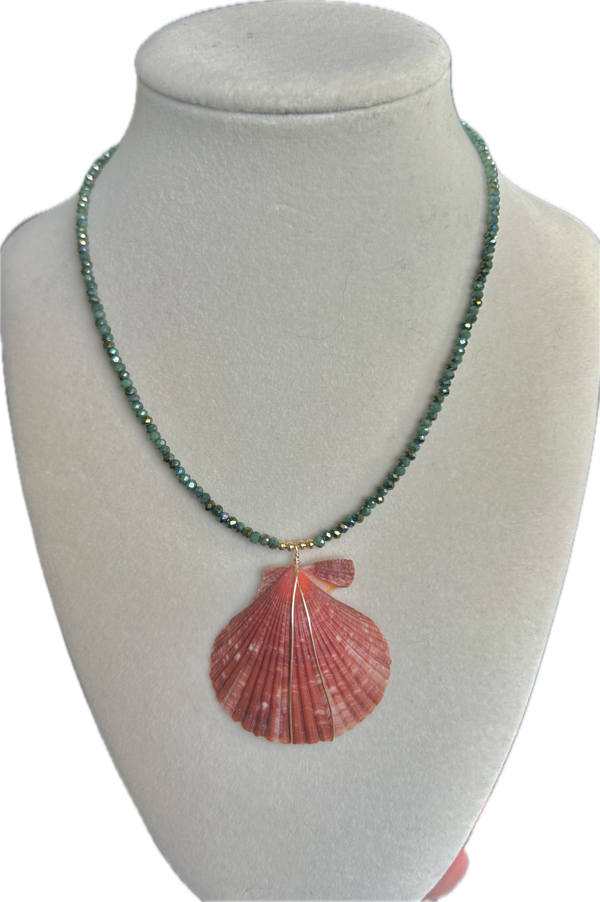 Lion’s Paw Scallop Shell & Green Gemstone Necklace – Bold Coastal Beauty
