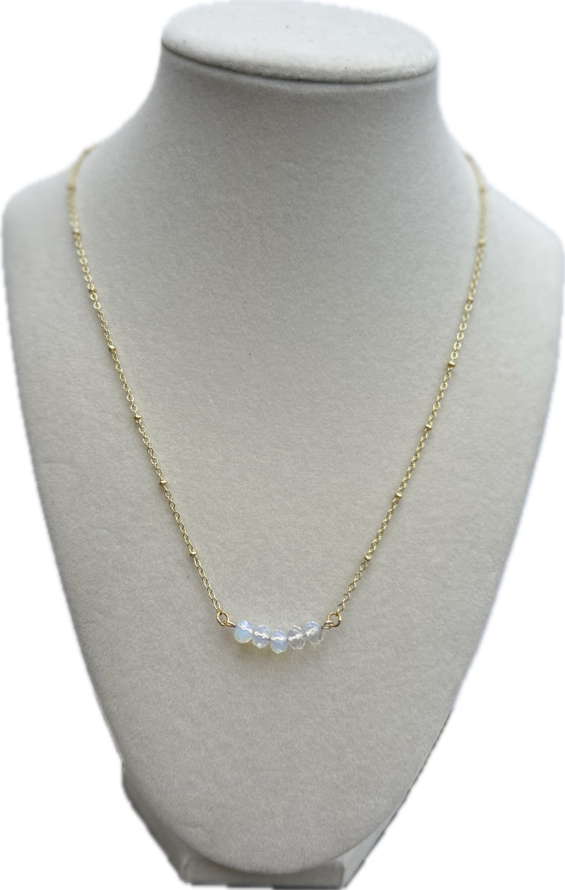 This dainty necklace features a row of luminous opalite beads strung delicately on a gold-filled chain. With their soft iridescence, the beads shift between milky white, blue, and hints of lavender depending on the light, giving the piece a dreamy, otherworldly glow.