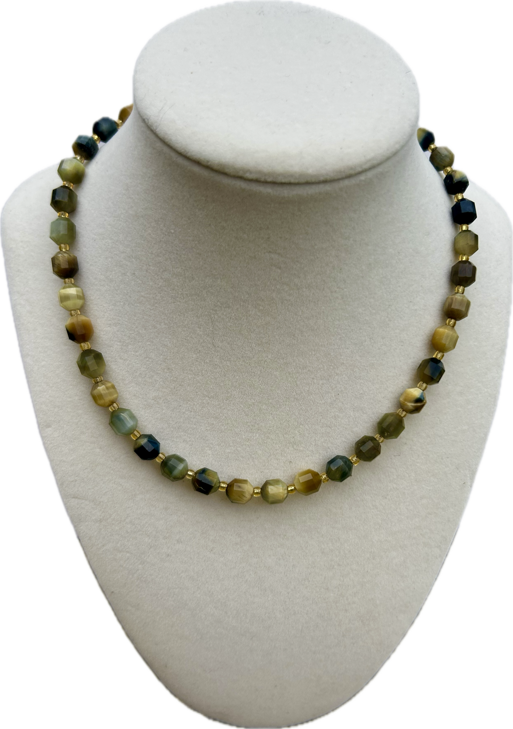 Illuminate your look with the captivating shimmer of this Golden Blue Tiger’s Eye necklace. Each faceted bead reveals a mesmerizing play of golden honey tones blended with deep ocean blues, creating a dynamic glow that shifts with the light.
