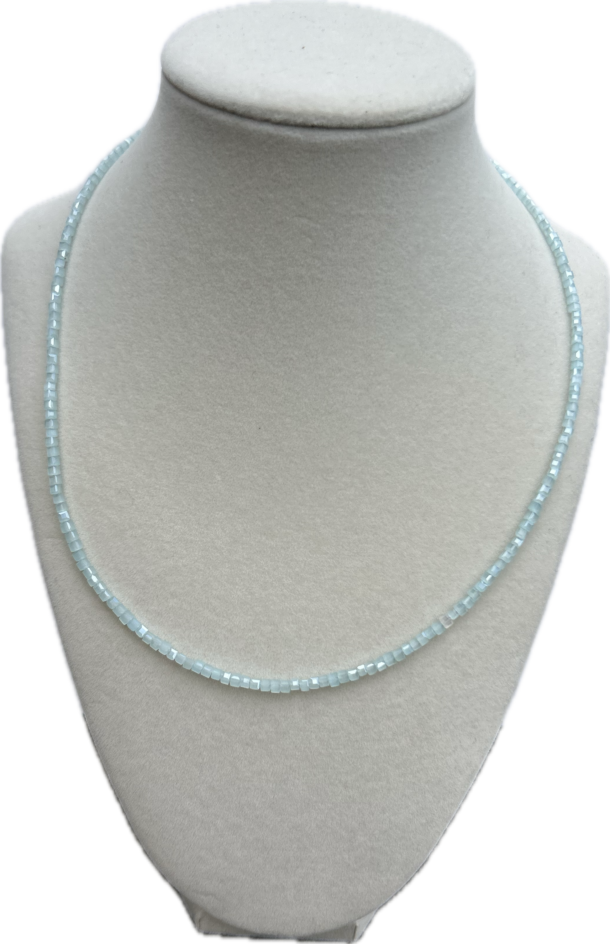This delicate necklace features faceted light blue cube beads, strung in a minimalist design that shimmers softly with every movement. The geometric cut of the beads gives the piece a modern edge, while the soft blue tones evoke the calm of a clear sky or gentle ocean waves.